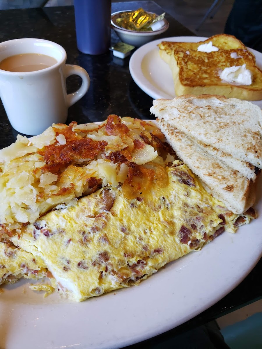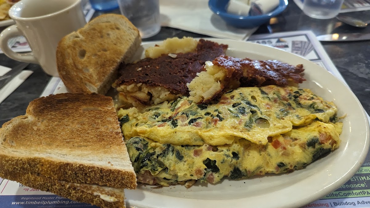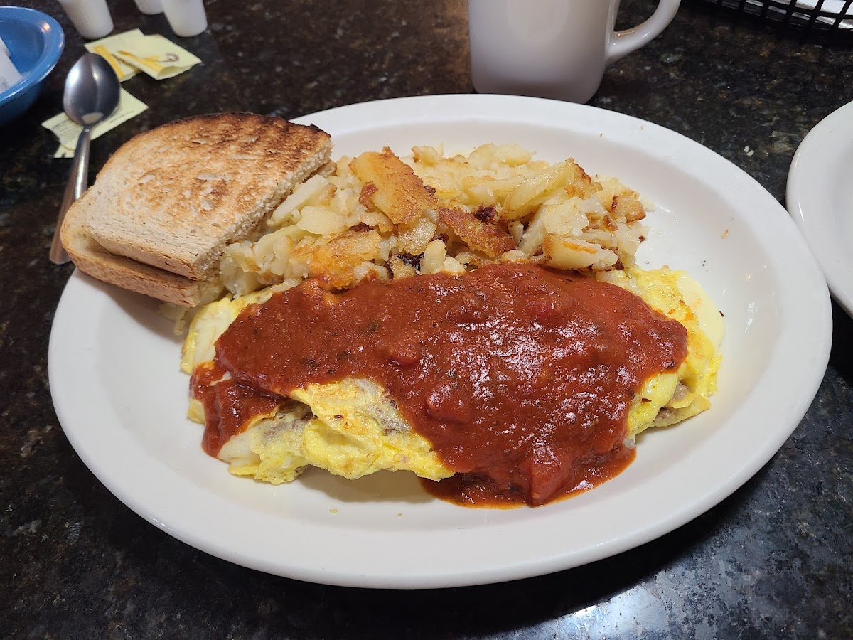 We had breakfast here for the first time. Nice variety of offerings. We split a Philly Cheesesteak omelet with potatoes and rye toast. It's served with marinara on top. Great service.
